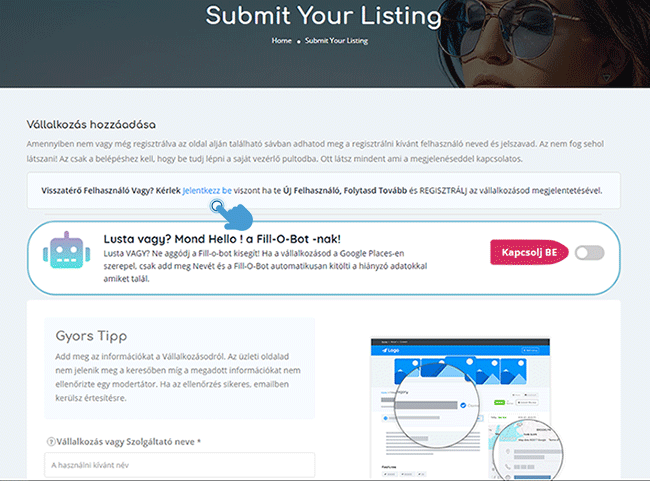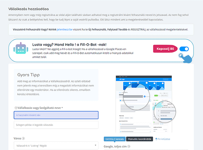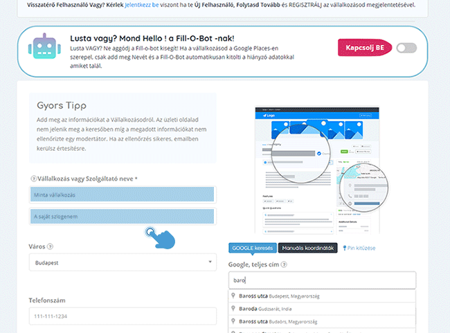 Amennyiben a vállalkozásod a Google Places-en szerepel, csak add meg Nevét és a Fill-O-Bot automatikusan kitölti a mezőket az adatokkal amiket talál.