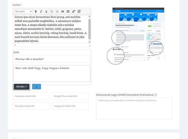 Itt van lehetőséged a leggyakrabban veled vagy a szakmáddal, esetleg a használt anyagokkal kapcsolatban felmerülő kérdések és válaszok megjelenítésére. Beírod a kérdést majd az alatta lévő mezőbe megadod a választ. A “+” gombra történő kattintással több kérdést és választ tudsz rögzíteni.